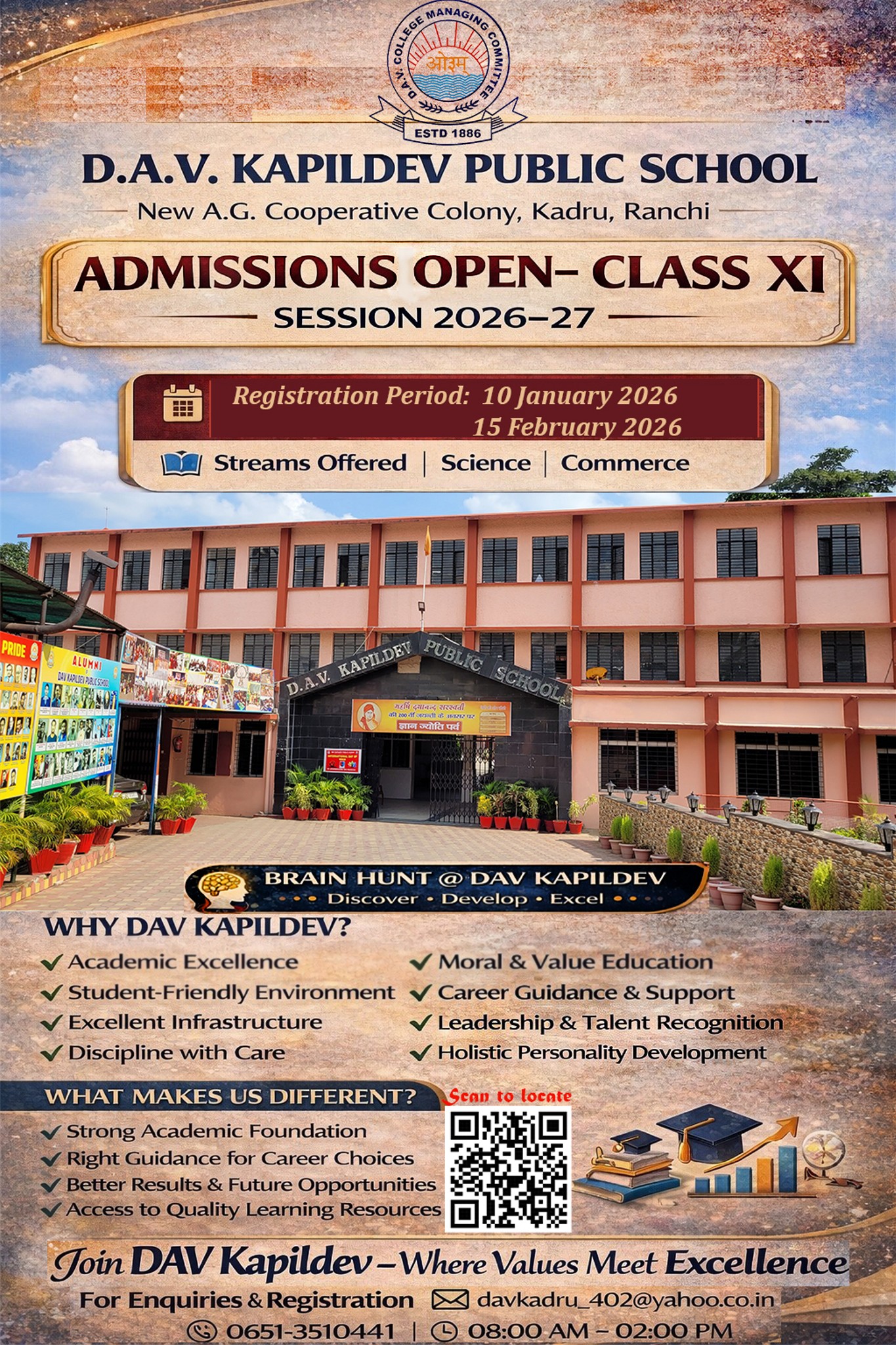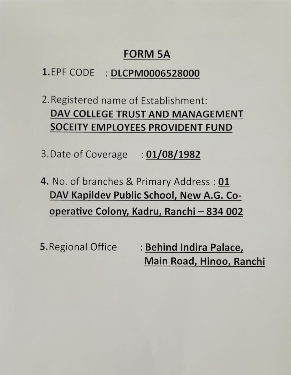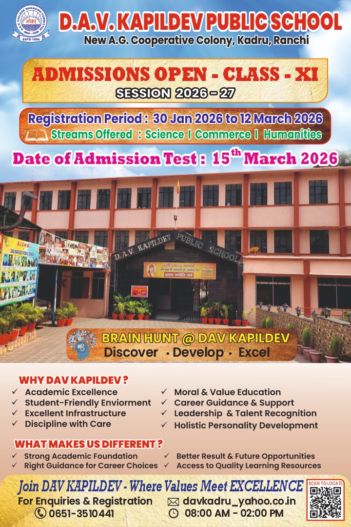 DAV Kapildev Public School located in A.G. Co-operative Colony, Kadru, Ranchi, just 3 kms. away from Ranchi Railway Station on a land given on lease for 99 years by A.G. Co-operative Society is another link in the chain of more than 600 DAV Public Schools all over the country, managed by DAV College Managing Committee, New Delhi.